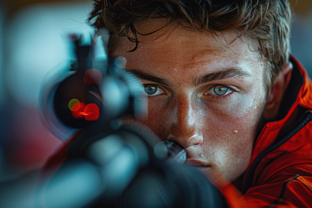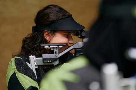 Focused young woman aiming with a rifle, precision shooting sport, competitive event, concentration and skill, determined athlete, sporting equipment, aiming for success, professional marksman