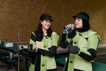 Two smiling female athletes in shooting gear, one drinking water, the other holding a target, indoor shooting range, sporting competition, teamwork and achievement, focus and determination.