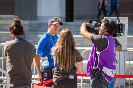 Minsk, Belarus - 23 Jun 2019: The cycling competitions of the 2019 2nd European Games in Minsk, men's road race. Group bicycle race for 180 km through the streets of city. Italy Winner BALLERINI Davide
