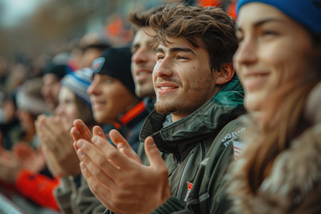 An image of a group of young and diverse people watching a sports game in a stadium. They are all smiling and cheering for their team.