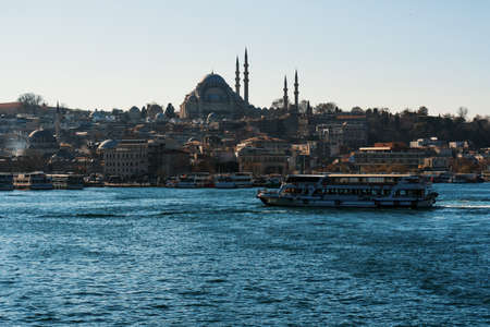 Old town and Suleymaniye Mosque with ferry on sea, Istanbul