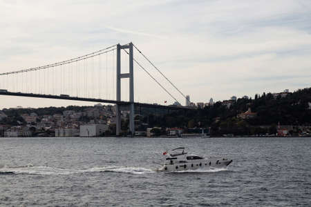 View of a yacht passing on Bosphorus and FSM bridge in Istanbul. It is a sunny summer day. Beautiful travel scene.