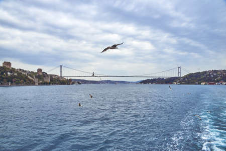 ISTANBUL, TURKEY - SEPTEMBER 29, 2013 Tourist boats and sea gulls pass under the Fatih Sultan Mehmet Bridge.