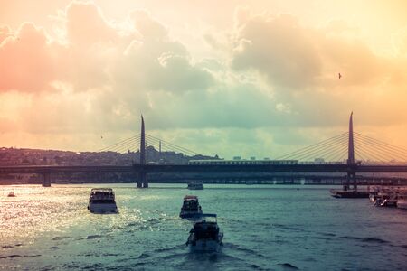 View of ferry and tour boats on Bosphorus in Istanbul. The bridge is also in the view. Sunset light effect is applied.