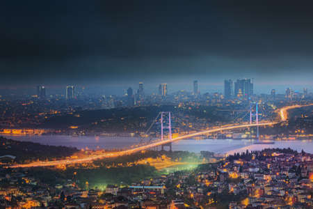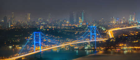 Istanbul background photo. Bosphorus Bridge and cityscape of Istanbul at night. Economy of Turkey concept image.