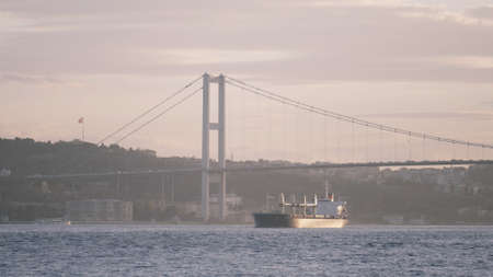 bridge over Bosphorus strait, and moored ships in Istanbul, Turkey