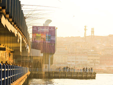 Fisherman fishing on the Galata Bridge in Istanbul Turkey
