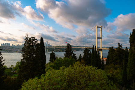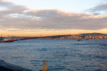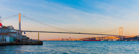 ISTANBUL TURKEY. Panoramic view of Istanbul Bosphorus on sunset. Istanbul Bosphorus Bridge (15 July Martyrs Bridge. Turkish: 15 July Sehitler Bridge). Beautiful cloudy blue sky.