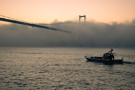 View of July 15 Martyrs Bridge (Bosphorus Bridge) with seagull and sunrise in fog clouds. Fishing boats in the foggy Bosphorus.