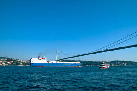 Turkey, Istanbul, Bosphorus Channel, Bosphorus Bridge, an cargo ship under the Bridge.