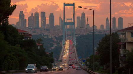 Istanbul Bosphorus Bridge at Dusk Sunset with Car traffic jam and City Skyline, Aerial View