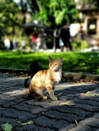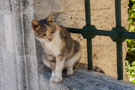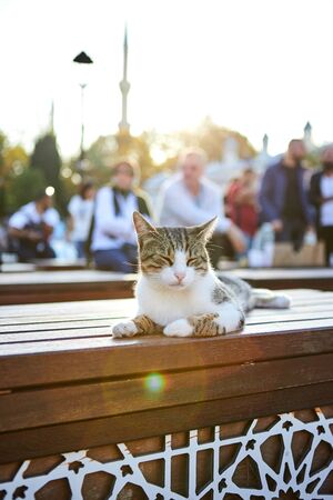 Stray kitten in the garden of a mosque in Istanbul. cute stray kitten. Cats of Istanbul background photo.