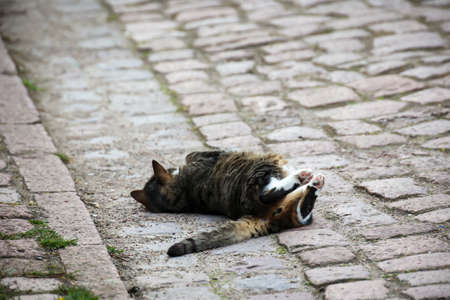 A tabby cat feels comfortable and rolls on the street.