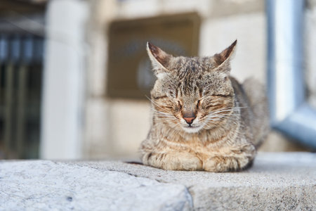 Homeless cat resting on the street. Oia village,Greece, Kos Island.