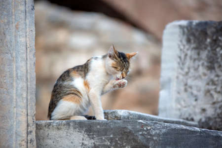 Cat sitting on the ruins of the Ancient Greek City Ephesus