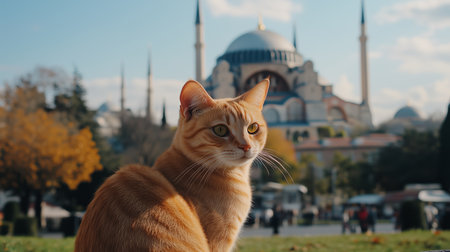 An orange tabby cat relaxes in front of the Hagia Sophia on a sunny day in Istanbul, showcasing the blend of history and nature