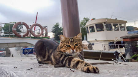 Wild kitten lying on wooden surface at pier. Istanbul, Turkey - Octoner 17, 2015.