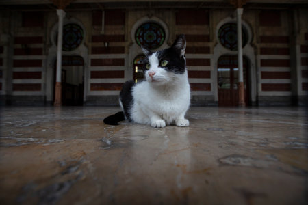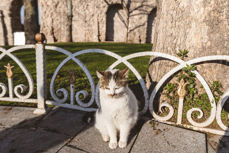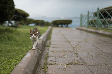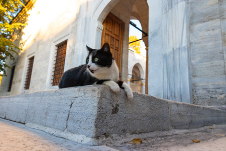 A stray cat walking in the garden of a mosque in Istanbul. Stray cats of Istanbul. Turkish culture background photo.