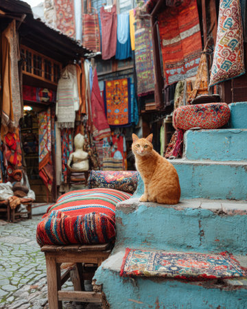 An adorable orange cat rests on steps adorned with colorful textiles and rugs, creating a vibrant and inviting atmosphere in a bustling market alley.