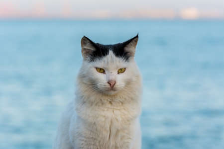 Portrait of homeless white cat sitting by the sea at the corniche park in Dammam city, Saudi Arabia