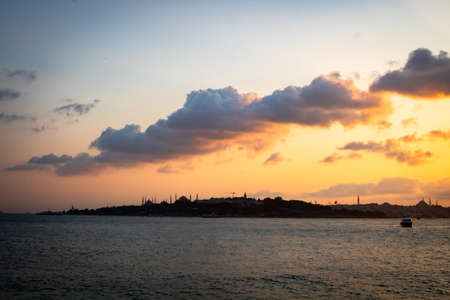 Cityscape of Istanbul with silhouettes of ancient mosques and minarets at sunset. Panoramic view, The Maiden's Tower, Galata Tower, Hagia Sophia, The Blue Mosque and Topkapı Palace in Istanbul.