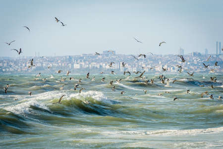 Seagulls over Sea of Marmara on a windy and stormy day