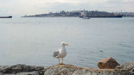 Seagull flying over the Bosphorus with Istanbul in the background in cloudy day, Turkey