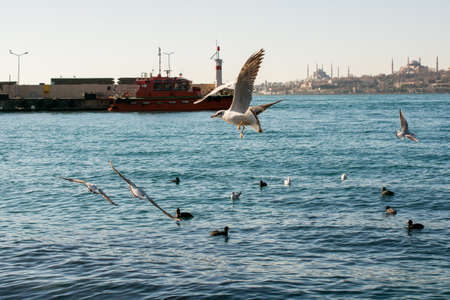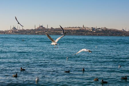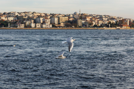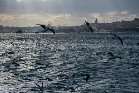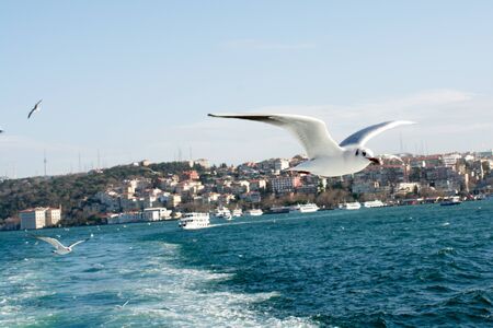 Istanbul Turkey - November 2015: Seagulls flying over bosphorus in Istanbul Turkey