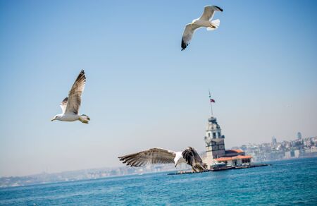 Istanbul background. Maiden's Tower and cityscape of Istanbul with seagulls. Travel to Turkey background photo. Selective focus on buildings.