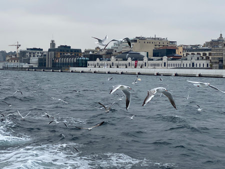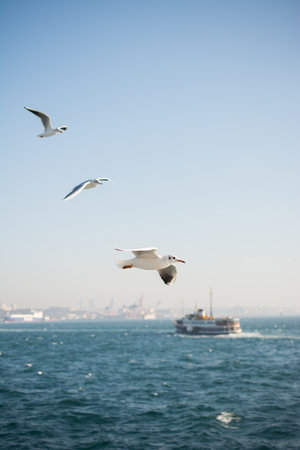 Seagulls flying over the sea in Istanbul, Turkey.