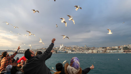 istanbul, Turkey, 2nd of January 2022 - People feeding pigeons on public transportation ferry