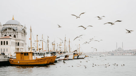 Boats in a harbor with birds flying in Istanbul during an overcast day