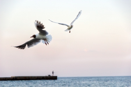 fly sea gulls on sea background