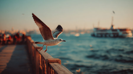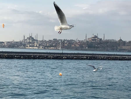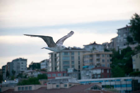 Seagull flying over the sea in Istanbul urban environment