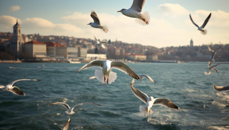 close up of seagulls flying around the bosphorus straits in istanbul turkey
