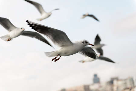 Selective focus in one seagull flying among other birds above a city