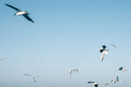 Many seagulls hover in the blue bright sky. Skyline background. Beautiful white clouds in the sky. Horizon of the sea