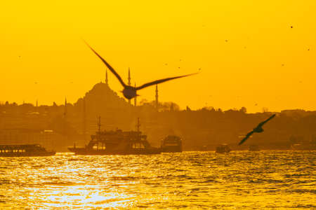 Ferries, seagulls and Suleymaniye Mosque in Istanbul. Istanbul background photo. Ramadan, oil lamp and iftar concept. Mosques of Istanbul.
