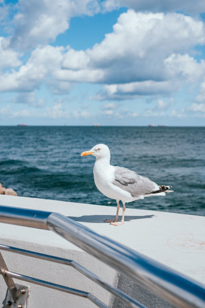 Seagulls near the sea and ship in the natural environment. Competition between gulls for food. Brown gray feathered bird with a yellow beak close-up in the open air.