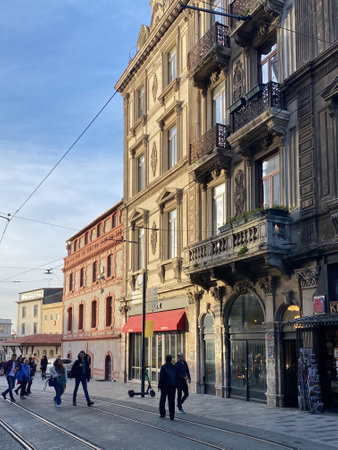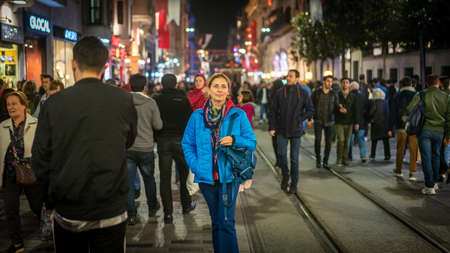 ISTANBUL, TURKEY - NOVEMBER 18, 2022: On Istiklal Street, one of the busiest streets of Istanbul, crowded people gather for shopping and sightseeing.