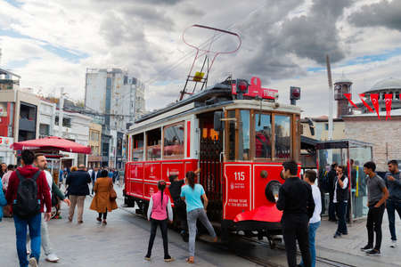 Istanbul, Turkey - October 6, 2019: retro red tram in Taksim Square. Popular tourist tramway in historic center at Istanbul.