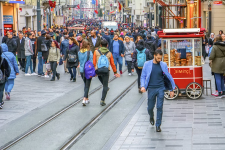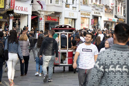 Istanbul, Turkey - October-27.2019: People visiting and shopping are crowded on Istiklal Avenue.