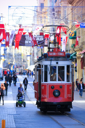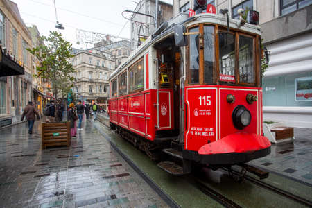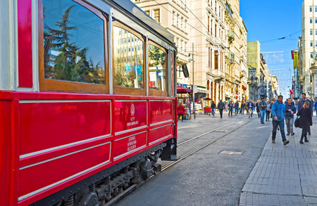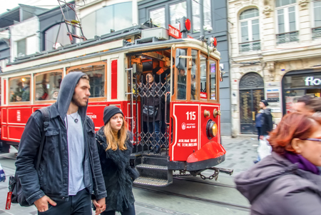 ISTANBUL, TURKEY - JANUARY 22, 2015: The main transport in Independence Avenue is the retro tram of Nostalgia Tramway, connecting the Taksim Square and Tunel, on January 22 in Istanbul.