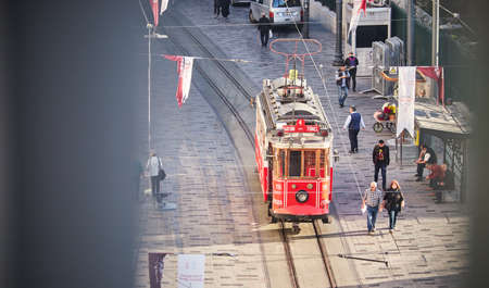 ISTANBUL, TURKEY – October 11, 2019 : Nostalgic traditional Red Tram in Beyoglu. Tramway line operates on Istiklal Street (popular destination in Istanbul) between Taksim Square and underground railway line - Tunnel.