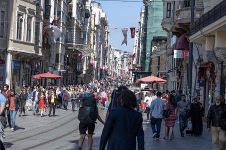 Tourists or people in Istiklal Caddesi or Istiklal Avenue in Taksim Istanbul. Istanbul Turkey - 3.27.2022