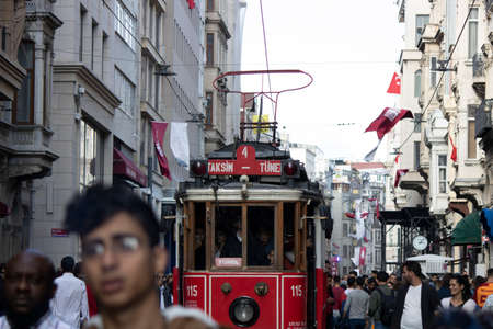 Istanbul, Turkey - September 21, 2012: the former tram on Istiklal Street in Istanbul, Taksim-Tunel carry passengers. A cold winter day.