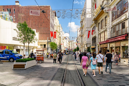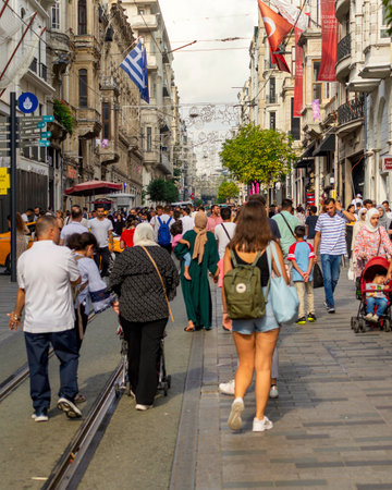 Istanbul, Turkey - August 25, 2022: Crowded Istiklal Street or Istiklal Caddesi, in a summer day, located at Beyoglu district, at the European side of Istanbul Province