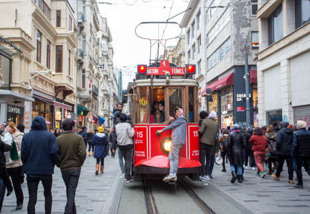 ISTANBUL, TURKEY - JANUARY 20, 2018: Historic Red Tram on Istiklal Street where the most popular destination of Istanbul for shopping and entertainment.