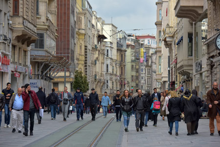 ISTANBUL - APRIL 7: Crowded istiklal street with tourists in Istanbul on April 07, 2013. It's is one of the most famous avenues in Istanbul, visited by nearly 3 million people in a single day over the course of weekends.