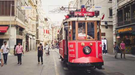 ISTANBUL, TURKEY - JUNE 26, 2015: A red classic tram in the crowded Istiklal street in the Beyoglu district of Istanbul, Turkey. It is the most famous street in Istanbul